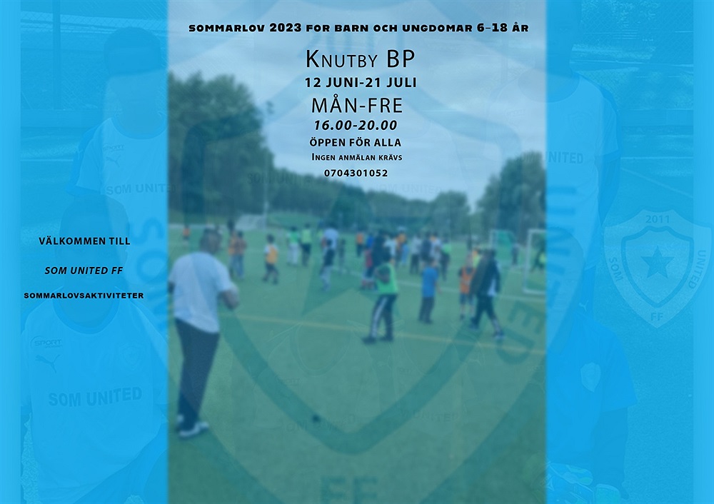 Mellan 12 juni - 21 Juli bjuder vi i Som United FF tillsammans med bland annat Stockholm Stad, Familjebostäder, Egen assistans och övriga sponsorer in alla barn och ungdomar mellan 6 - 18 år till gratis sommarcamp på Knutby BP. Man behöver inte vara medlem i föreningen för att delta, alla är välkomna.
